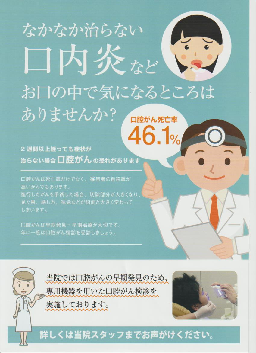 口腔がん健診は定期検診と同時でも可能です、その場合には健診のほうでご予約下さい。